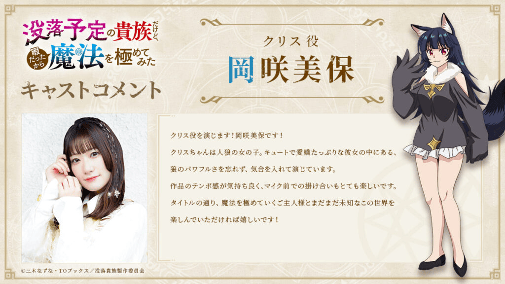 Okasaki Miho (Chris): “I’m Okazaki Miho, and I’ll be playing the role of Chris! Chris is a werewolf girl. She’s cute and charming, but she also has the power of a wolf inside her, and I’m putting all my energy into the role. The tempo of the work is pleasant, and the exchanges in front of the microphone are a lot of fun. As the title suggests, I hope you enjoy this still-unknown world with the master who is perfecting his magic!”