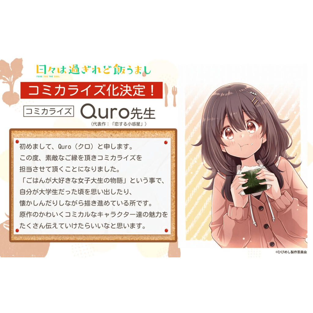 “Nice to meet you, my name is Quro (Kuro). I have been given the wonderful opportunity to work on the comic adaptation. It is a story about a female college student who loves food, so I am currently drawing it while remembering and reminiscing about my time as a college student. I hope to be able to convey the charm of the cute and comical characters from the original work.”