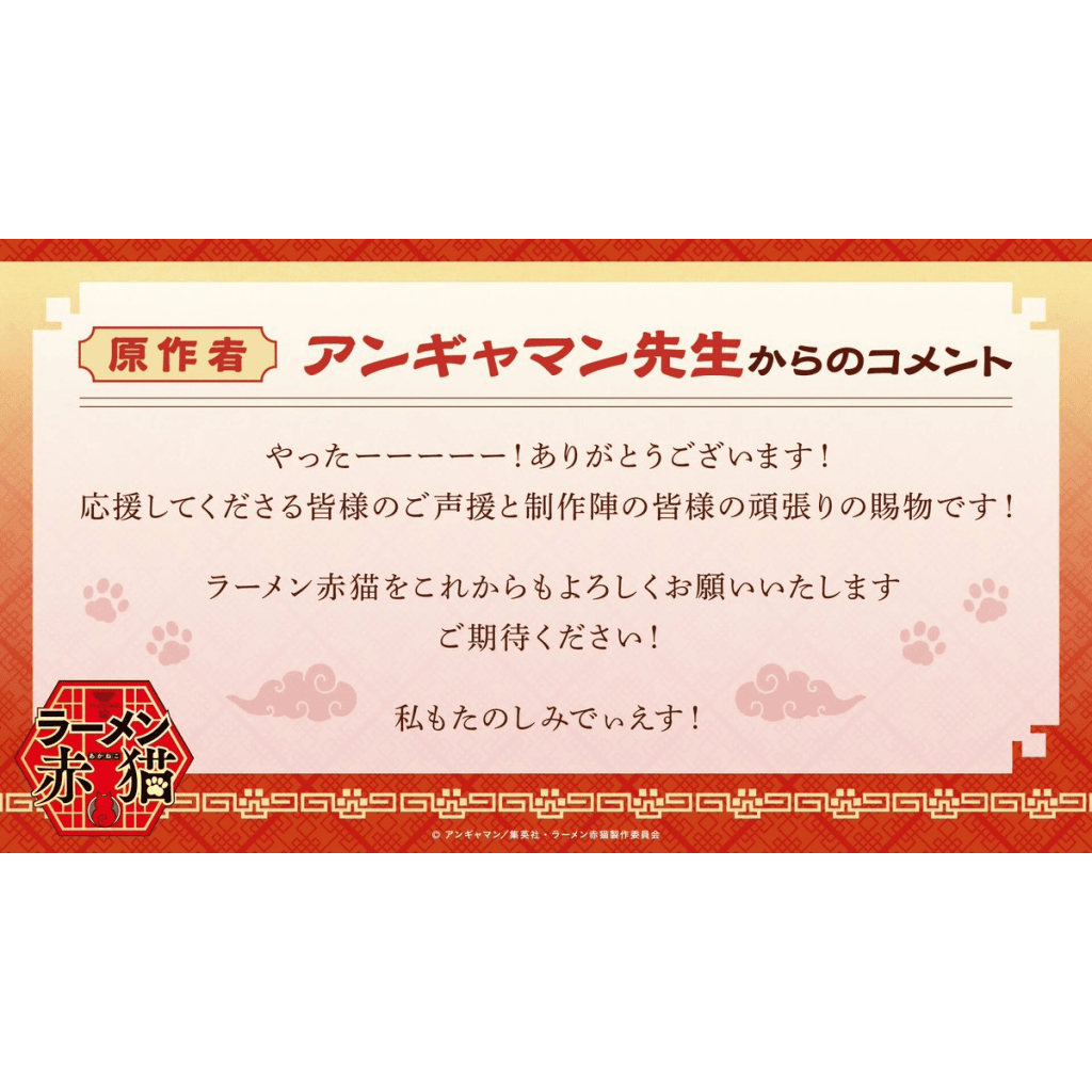 “Yay!!! Thank you! It’s all thanks to everyone who supports us and the hard work of the production team! Please continue to support Ramen Akaneko, and look forward to the second season! I’m looking forward to it too!”