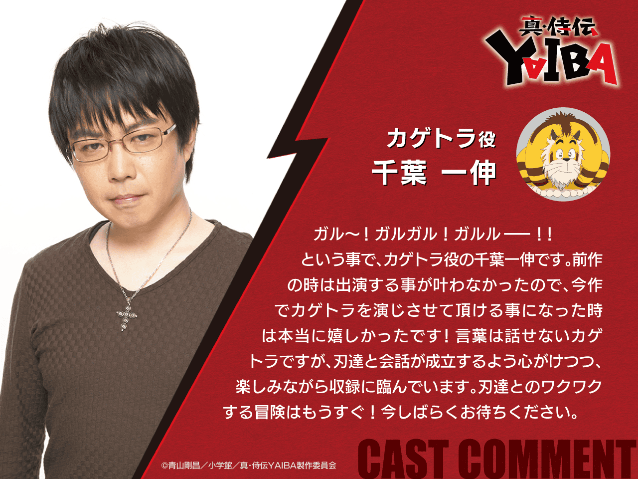 So, I am Chiba Isshin, playing the role of Kagetora. I wasn’t able to appear in the previous work, so when I was given the opportunity to play Kagetora in this one, I was truly happy! Kagetora may not be able to speak words, but I keep in mind making it feel like conversations with Yaiba and the others are actually happening, all while enjoying the recording. The thrilling adventure with Yaiba and the others will begin soon! Please wait just a little longer.”