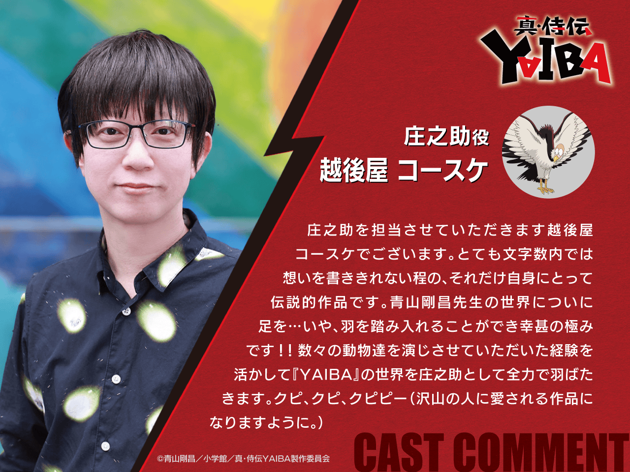 • “I am Echigoya Kousuke, and I will be playing Shounosuke. There is no way I can fully express my feelings within the character limit. It is that much of a legendary work for me. To finally set foot… no, set wings into Gosho Aoyama-sensei’s world is a great honour!! Drawing on my experience voicing many different animals, I will give my all to Shounosuke and take flight in the world of Yaiba! Kupi, kupi, kupipii! (May this work be loved by many people.)”