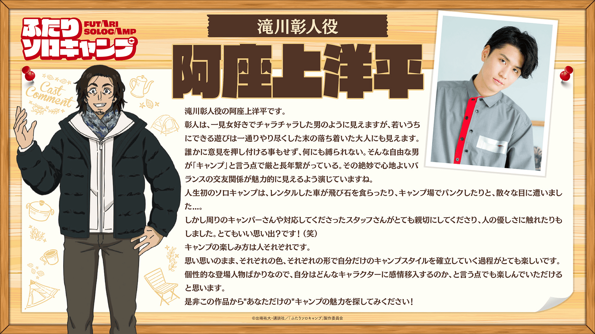 The official website of the anime adaptation of Debata Yuudai’s Solo Camping for Two has announced that voice actor Azakami Youhei will voice Takigawa Akihito in the upcoming anime.