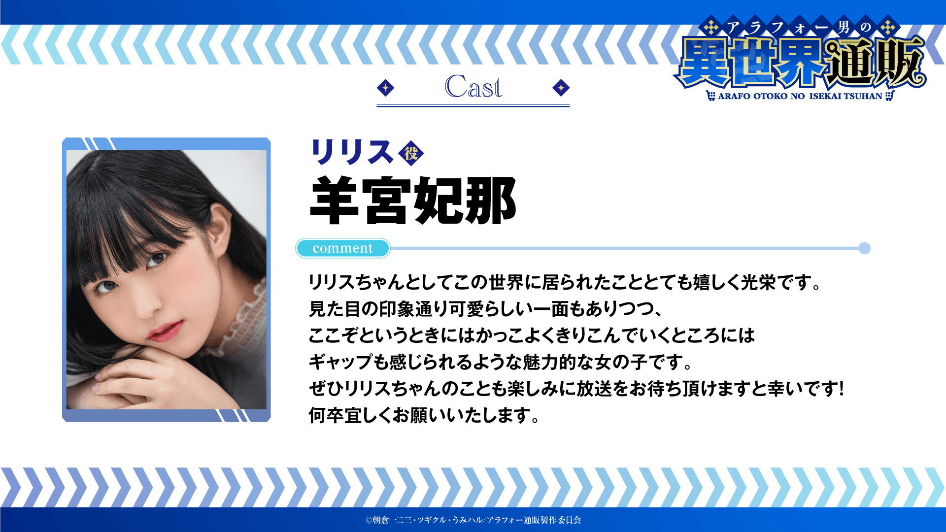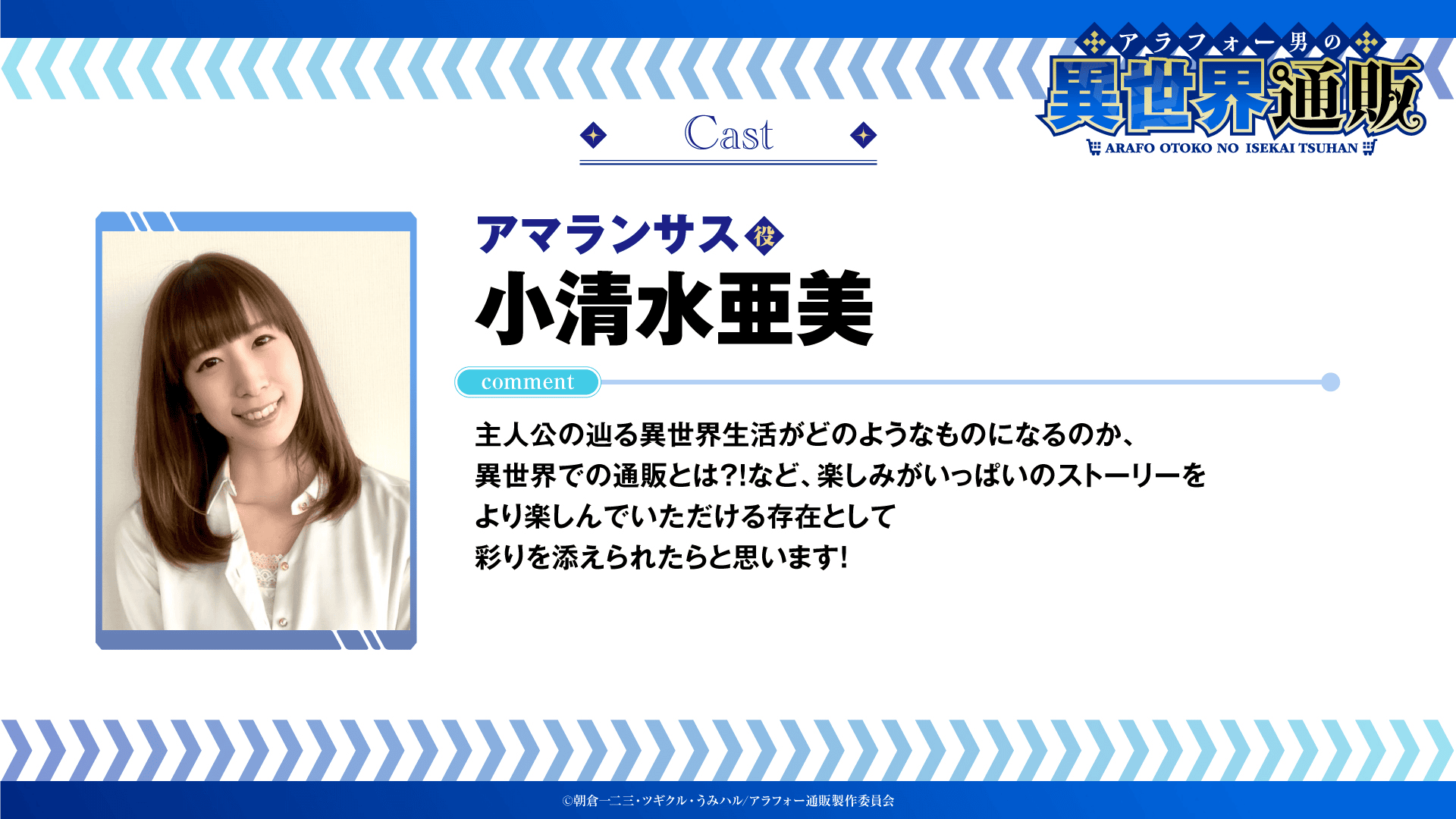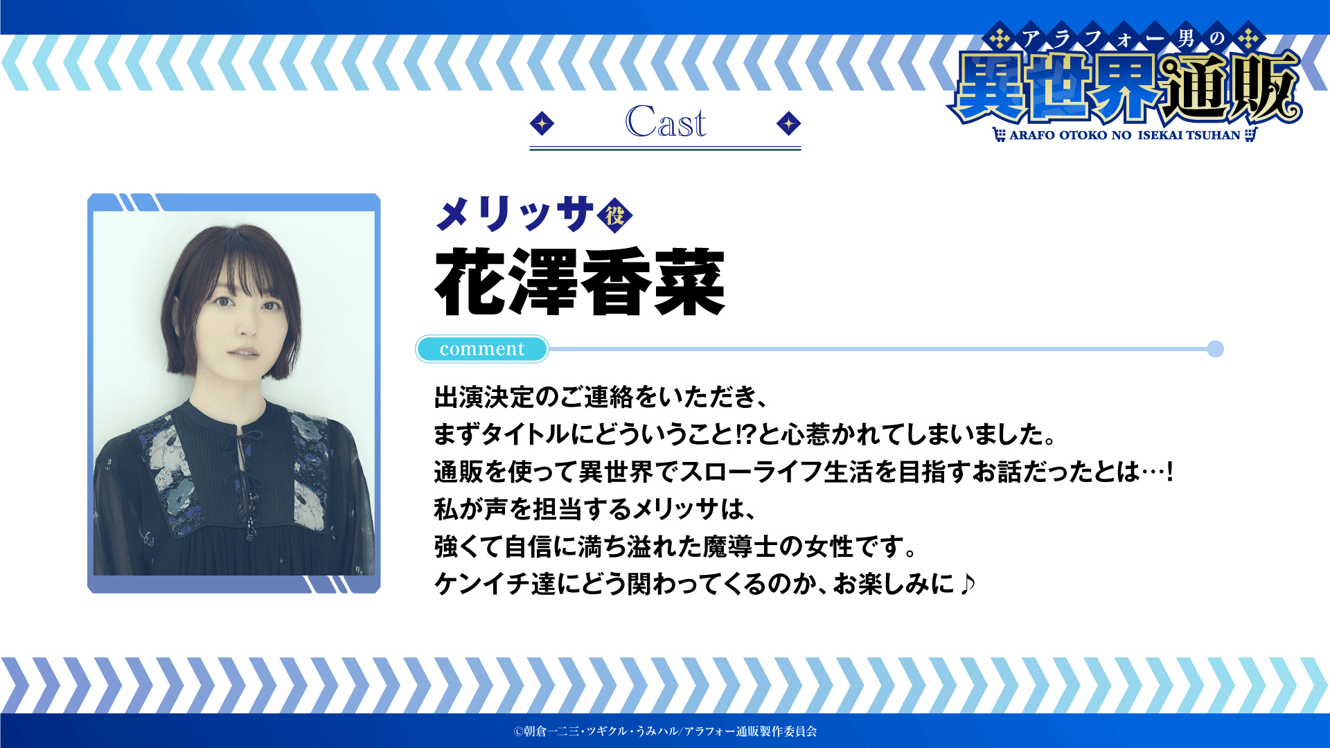 The official website of the anime adaptation of Asakura Hifumi’s The Daily Life of a Middle-Aged Online Shopper in Another World manga series has announced three new cast members.