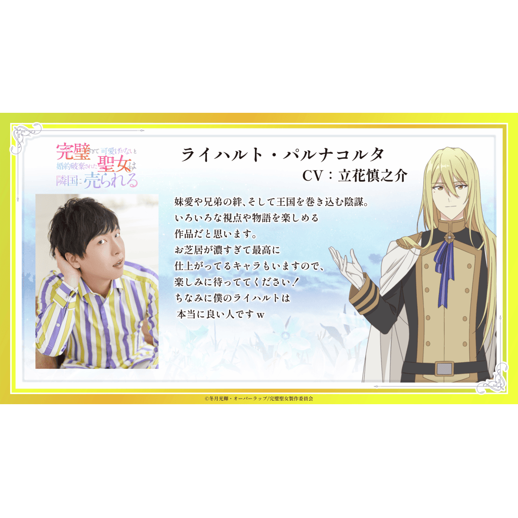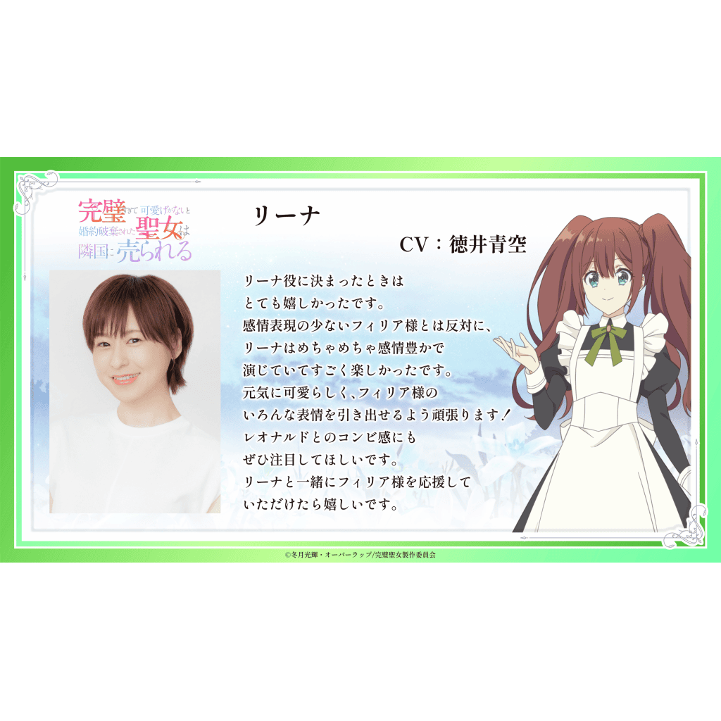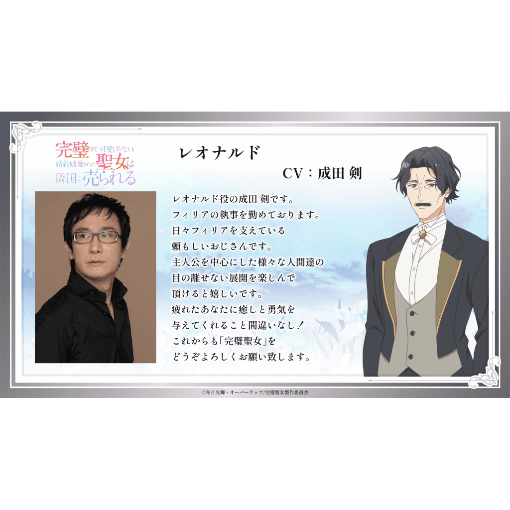 Narita Ken: “I’m Ken Narita, who plays Leonardo. He serves as Philia’s butler. He’s a reliable man who supports Philia every day. I hope you enjoy the exciting developments of the story, with the main character at the centre and the people around them. I’m sure it will give you healing and courage when you’re tired! I hope you will continue to support ‘The Perfect Saint.'”