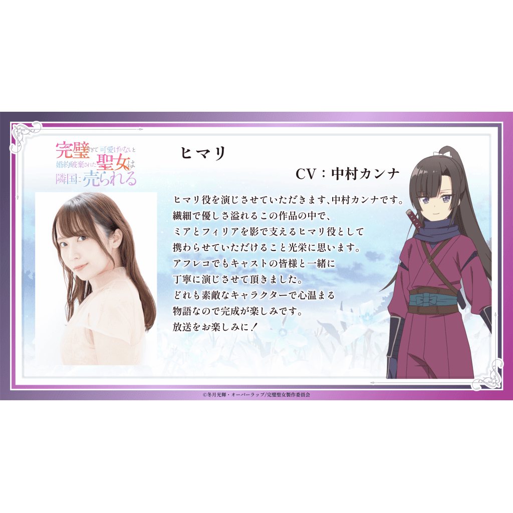 Nakamura Kanna: “I’m Nakamura Kanna, and I will be playing the role of Himari. I’m honoured to be involved in this delicate and gentle work as Himari, who supports Mia and Philia from behind the scenes. I worked carefully with the other cast members during the dubbing. It’s a heartwarming story with wonderful characters, so I’m looking forward to seeing it completed. Please look forward to the broadcast!”