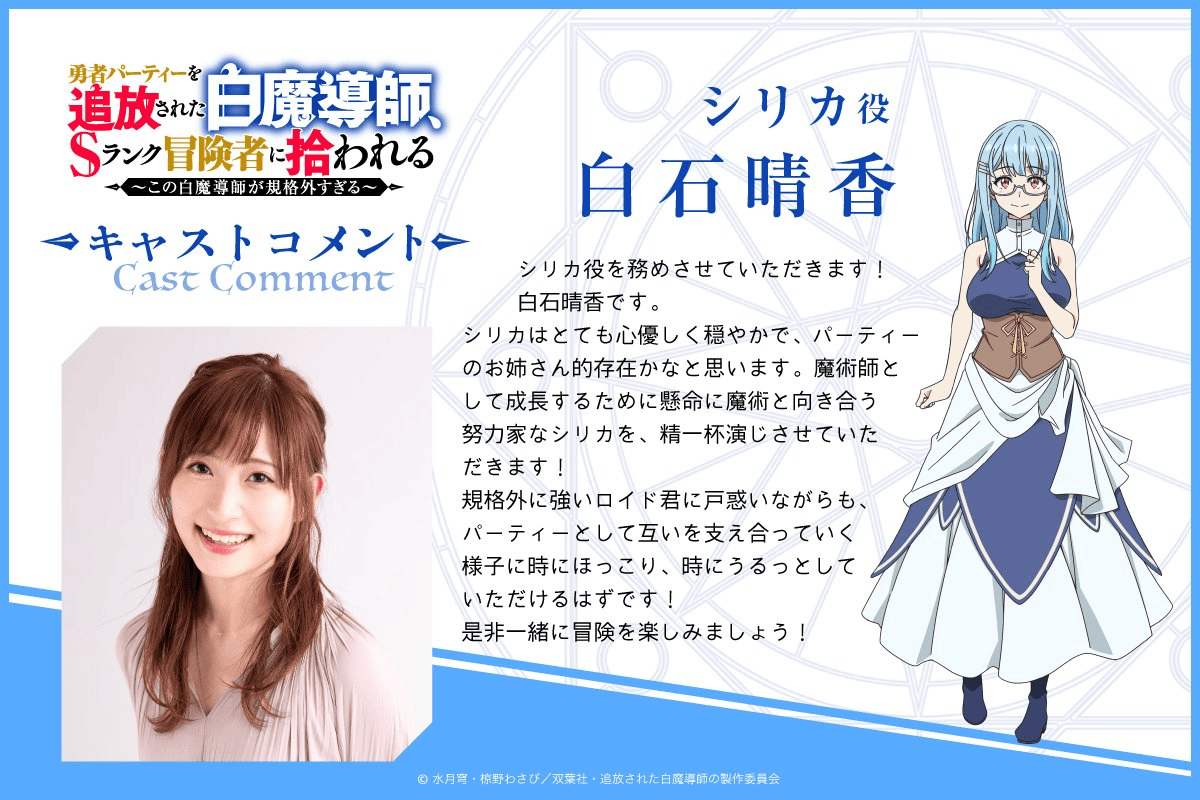 The official website of the anime adaptation of Suigetsu Sora’s White Magician Exiled from the Hero Party, Picked Up by S-Rank Adventurer manga series has released the first teaser trailer, showcasing a July 2025 release date.